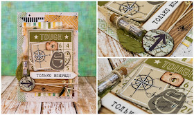 У меня сложилась туристическая открытка. Использовала разную бумагу, бинго-карточку, вырезалочки всякие, тонированный бинт, чипборд фотоаппарата, листик, вощеный шнур, подвеску. А в бутылке карта, чтоб всегда идти в нужном направлении)